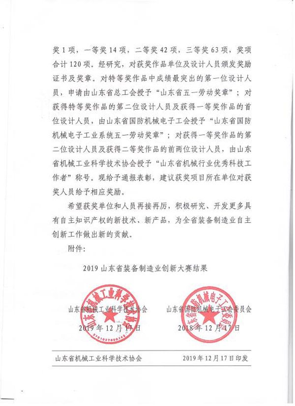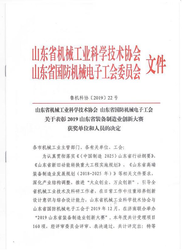 山東省裝備制造業創新大賽二等獎